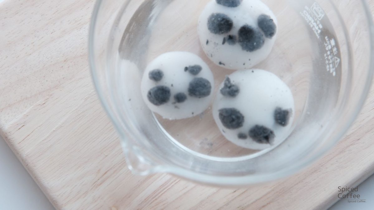 - 白玉団子を包み終えたら、沸騰したお湯に入れ白玉が浮いてきたら火を止めて冷水に取ります